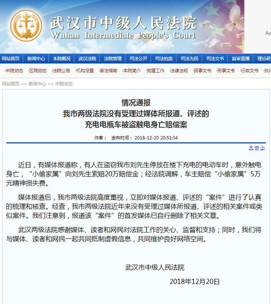 原标题:情况通报:我市两级法院没有受理过媒体所报道、评述的充电电瓶车被盗触电身亡赔偿案