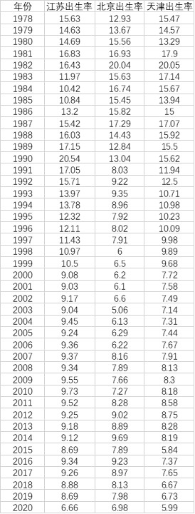 江苏之外,北京、天津等地的出生率也已连续多年低于1%。根据《北京统计年鉴2021》,北京1991年出生率跌破1%,至今已连续30年出生率低于1%。根据《天津统计年鉴2021》,天津自1997年以来,已经连续24年出生率低于1%。