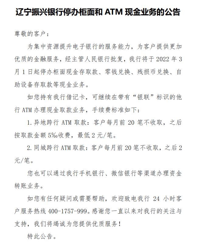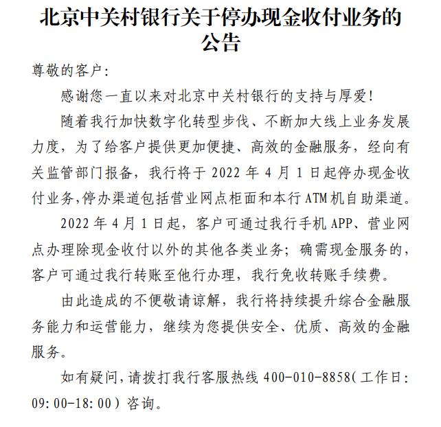 其中,辽宁振兴银行发布停办柜面和ATM现金业务的公告,经主管人民银行批复,从2022年3月1日起,停办柜面现金存取款、零钱兑换、残损币兑换、ATM存取款等现金业务。北京中关村银行发布关于停办现金收付业务的公告,经向有关监管部门报备,将于2022年4月1日起停办现金收付业务。