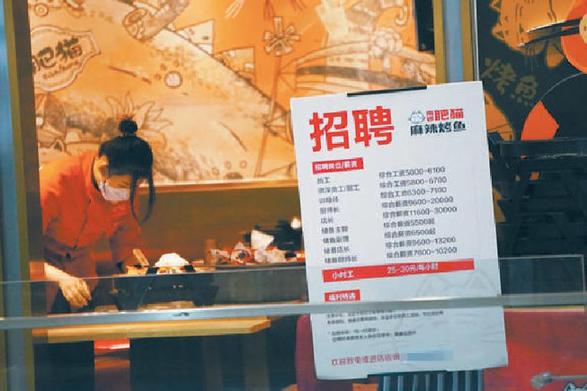在这个商场,招服务员的餐厅,有四五家。记者随后又去了附近的另两个商场,情况类似,总有几家餐厅在招人。服务员们在店内忙碌着,看起来并不缺人,但店门口是醒目的招聘广告。