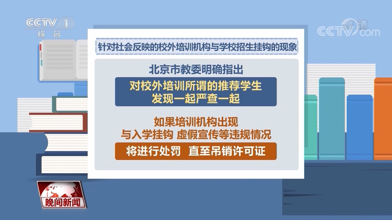 针对社会反映的校外培训机构与学校招生挂钩的现象,北京市教委明确指出,对校外培训所谓的推荐学生,发现一起严查一起,如果培训机构出现与入学挂钩、虚假宣传等违规情况将进行处罚,直至吊销许可证。