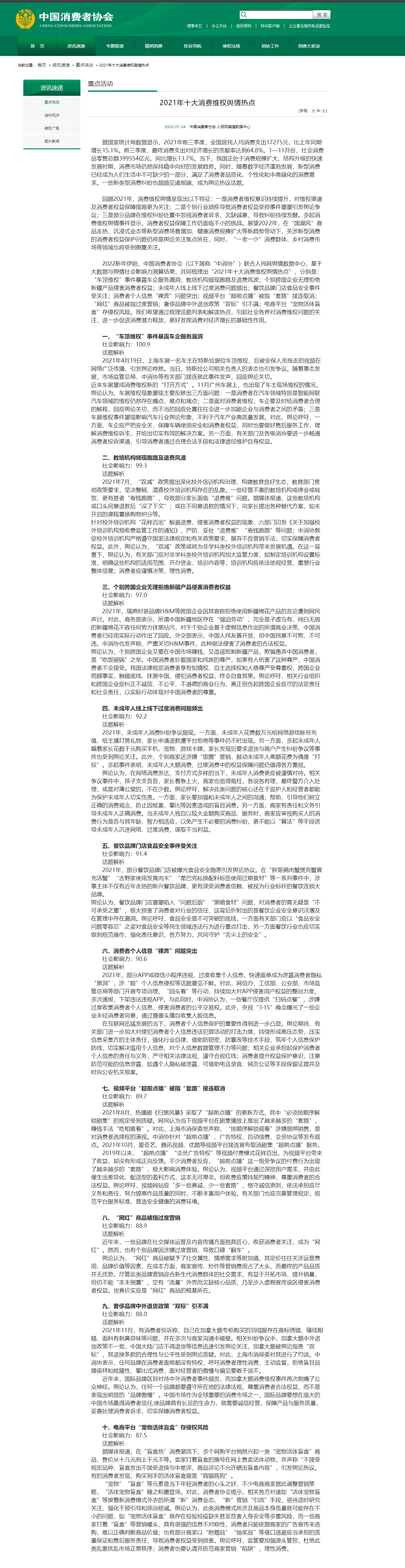 据中国消费者协会网站消息,中国消费者协会发布2021年十大消费维权舆情热点,上榜的十大热点分别为:“车顶维权”事件暴露车企服务漏洞;教培机构频现跑路及退费风波;个别跨国企业无理拒绝新疆产品侵害消费者权益;未成年人线上线下过度消费问题频出;餐饮品牌门店食品安全事件受关注;消费者个人信息“裸奔”问题突出;视频平台“超前点播”被指“套路”接连取消;“网红”商品被指过度营销;奢侈品牌中外退货政策“双标”引不满;电商平台“宠物活体盲盒”存侵权风险。