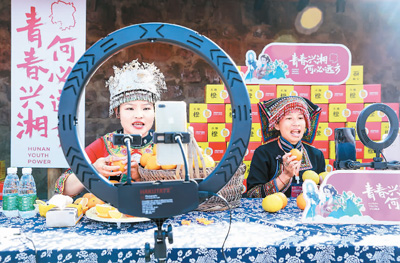 近日,在湖南省怀化市麻阳苗族自治县隆家堡乡步云坪村霞飞云果园,主播正通过直播推销麻阳冰糖橙。滕树明摄