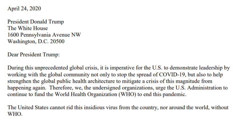 24日,来自世界各地的一千多个组织和个人,包括慈善机构、医疗机构和医学专家,联名签署了一封写给白宫的信,敦促特朗普政府继续资助世界卫生组织。