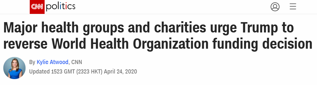 美国总统特朗普4月14日宣布停止对世界卫生组织(WHO)进行资助,原因是世卫组织在疫情期间严重管理不当,掩盖真实情况。该指控遭到多方批驳。