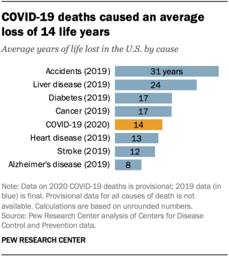 皮尤研究院认为,2020年因新冠而导致“寿命年”损失的情况并未被广泛关注,因为迄今为止,美国因新冠病毒死亡的人中,65岁及以上的占绝大多数(约80%)。据《纽约时报》此前相关报道,更有一些人表示“无论如何,这些老年人已经接近生命的尽头”。