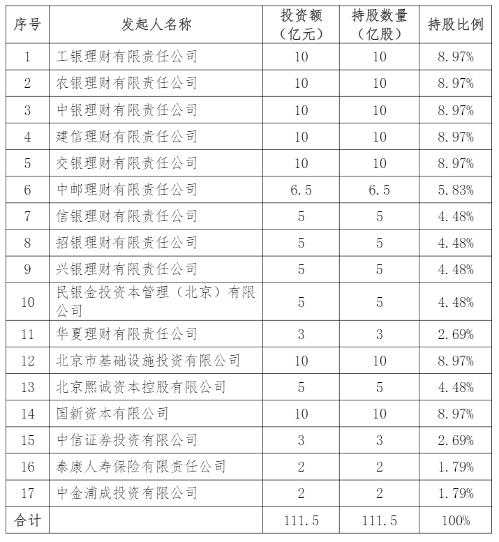 央视网记者注意到,此次拟成立的国民养老保险股份有限公司发起人以理财公司为主。五大行的理财子公司、国新资本、北京市基础设施投资有限公司均投资10亿元,持股8.97%。国新资本母公司中国国新控股有限责任公司是国务院国资委监管的中央企业之一,2016年初被国务院国有企业改革领导小组确定为国有资本运营公司试点。北京市基础设施投资有限公司则是由北京市人民政府国有资产监督管理委员会出资成立的国有独资公司。此外,西城区国有资本市场化运营专业平台旗下公司北京熙诚资本控股出资5亿元,持股4.48%。