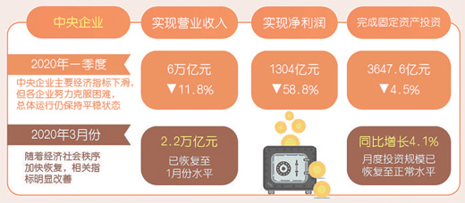 第一季度,受疫情影响,中央企业生产经营面临诸多挑战,主要经济指标出现下滑:实现营业收入6万亿元,同比下降11.8%,超过八成企业营业收入下滑;实现净利润1304亿元,同比下降58.8%; 3月份月度净利润比2月份明显回升,但比上年同期仍有较大差距。