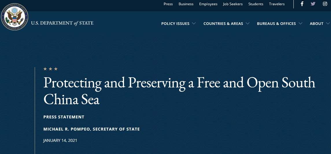 蓬佩奥在美国务院网站的声明中宣称,美国和所有守法国家在维护南海自由开放方面有共同利益。所有国家,无论军事与经济力量如何,都应享有国际法保障的权利和自由,而不必担心受到“胁迫”。他声称美国正采取更多行动来捍卫这些权利和自由,根据美国《移民与国籍法案》,国务院向涉嫌参与在南海有争议地区大规模填海、建设或军事化,或胁迫阻止其他东南亚国家开采南海近海资源的中国公民实施签证限制,这些人包括中国国有企业高管、中国共产党及解放军海军官员,而他们的直系亲属也可能受此限制。