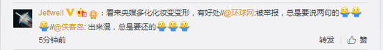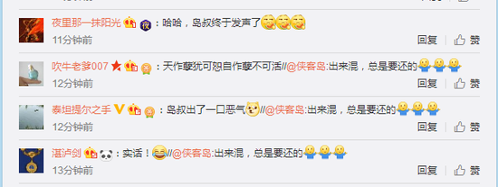 今早8:17多少,侠客岛官微转发了新京报报道此消息的微博,配发了“出来混,总是要还的”。