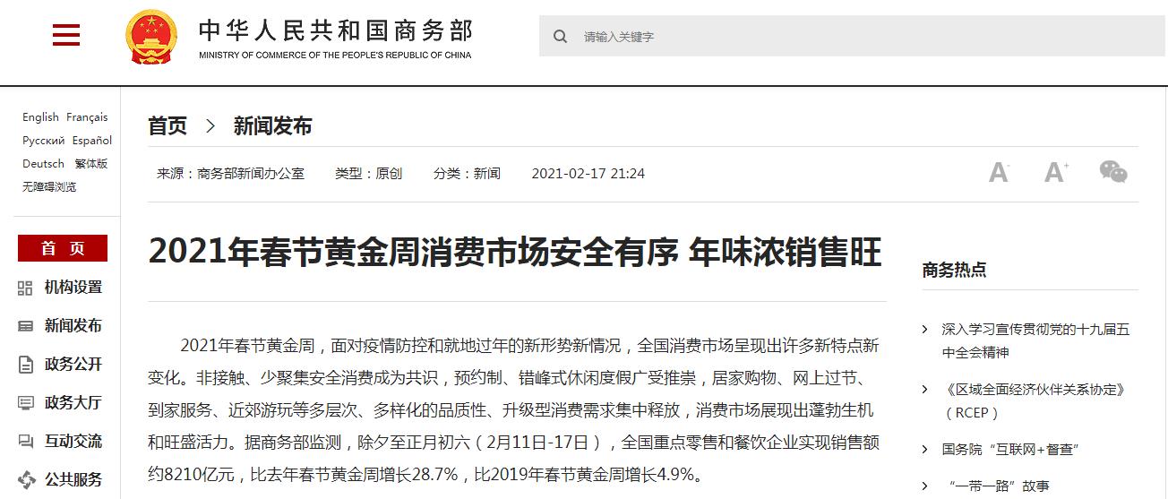 据商务部网站17日消息,据商务部监测,除夕至正月初六(2月11日-17日),全国重点零售和餐饮企业实现销售额约8210亿元,比去年春节黄金周增长28.7%,比2019年春节黄金周增长4.9%。