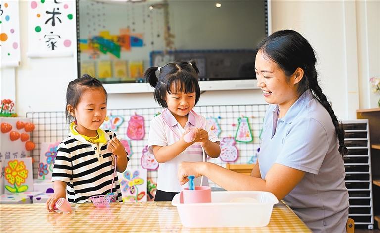 7月4日,邢台市南和区小博士第三幼儿园托育班,保育师带领孩子们做游戏。目前,河北省已建成一批设施完备、服务优质的普惠托育机构。