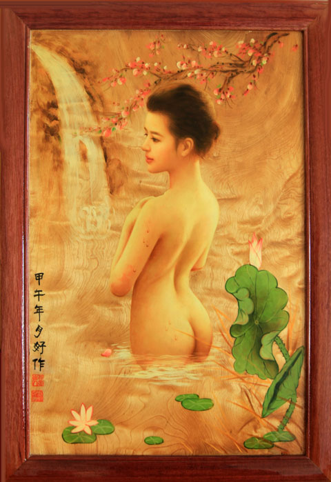 刘月好先生首创利用珍贵的金丝楠木作画,立体感更强,画面更加逼真唯美,为绘画注入了新的血液。此幅《美女出浴》图,用珍贵金丝楠木配以精美上等画作,国内首创,十分珍贵,极具收藏价值。