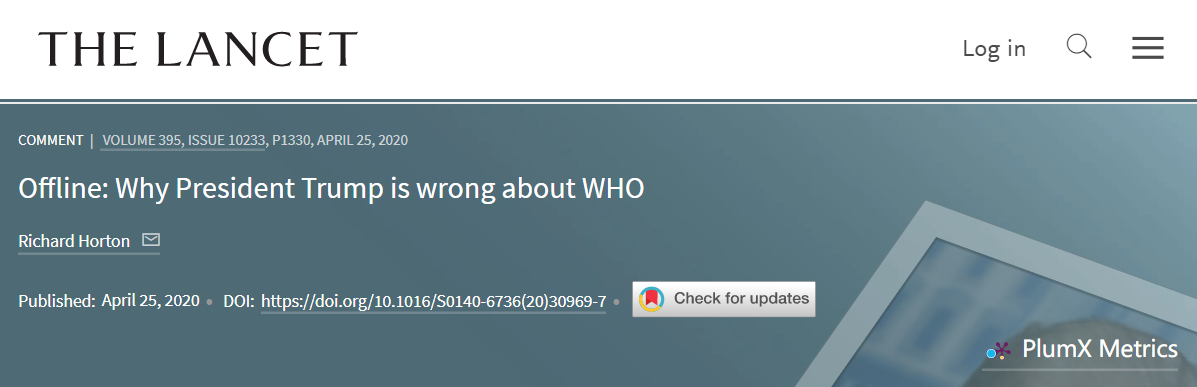《柳叶刀》主编:特朗普对世卫组织的指控毫无根据