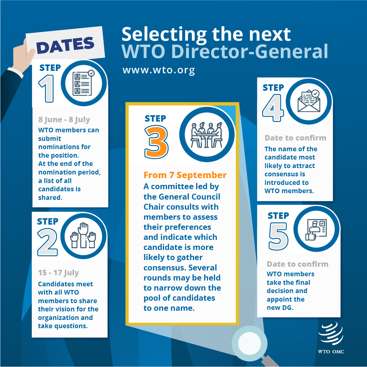 目前,来自墨西哥、尼日利亚、埃及、摩尔多瓦、韩国、肯尼亚、沙特阿拉伯和英国的八位候选人正在竞选世贸组织新总干事,竞选程序将于9月7日结束,之后总理事会将与世贸组织各成员举行多轮磋商,询问其意向人选,逐渐缩小范围至一名最终候选人。(总台记者 朱赫)