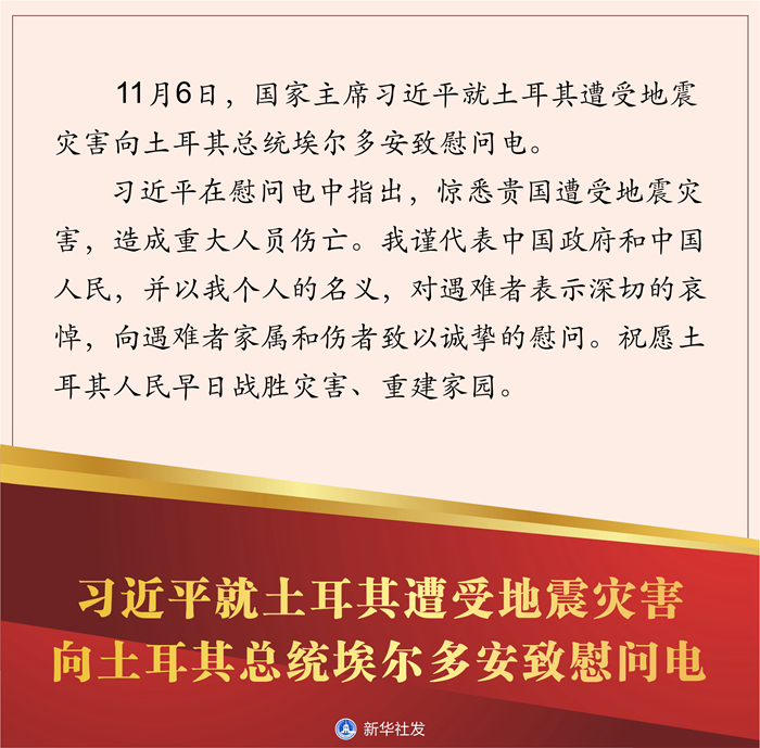 11月6日,国家主席习近平就土耳其遭受地震灾害向土耳其总统埃尔多安致慰问电。