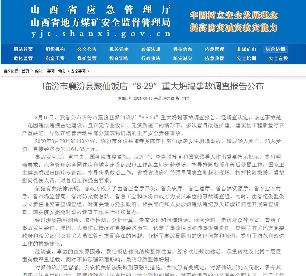 8月16日,山西省公布临汾市襄汾县聚仙饭店“8·29”重大坍塌事故调查报告。经调查认定,该起事故是一起因违法违规占地建设,且在无专业设计、无资质施工的情形下,多次盲目改造扩建,建筑物工程质量存在严重缺陷,导致在经营活动中部分建筑物坍塌的生产安全责任事故。