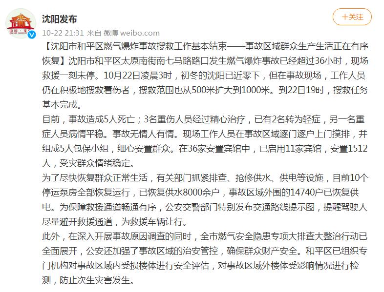 据“沈阳发布”官方微博消息,沈阳市和平区太原南街南七马路路口发生燃气爆炸事故已经超过36小时,现场救援一刻未停。到22日19时,搜救任务基本完成。